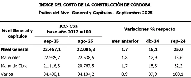 Durante el mes de septiembre de 2025, el Índice del Costo de la Construcción de Córdoba (ICC-Cba) registró una variación mensual del 1,7% en su Nivel General y del 25% con relación a septiembre de 2024.